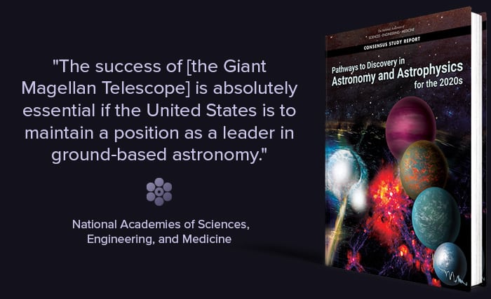 The Giant Magellan Telescope is America’s best path to lead space science in the Southern Hemisphere for the next 50 years. Backed by $1 billion in private funding, a National Science Foundation investment would complete construction on a globally competitive timeline.