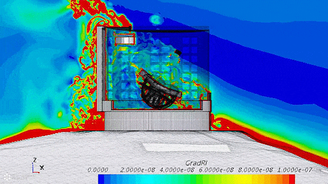 Simulation of the magnitude of refractive index spatial gradient distribution on the telescope enclosure mid-sectional plane. The Giant Magellan’s computational fluid dynamics model is used to simulate and analyze the aero-optical environment around the observatory. Credit: Giant Magellan Telescope – GMTO Corporation