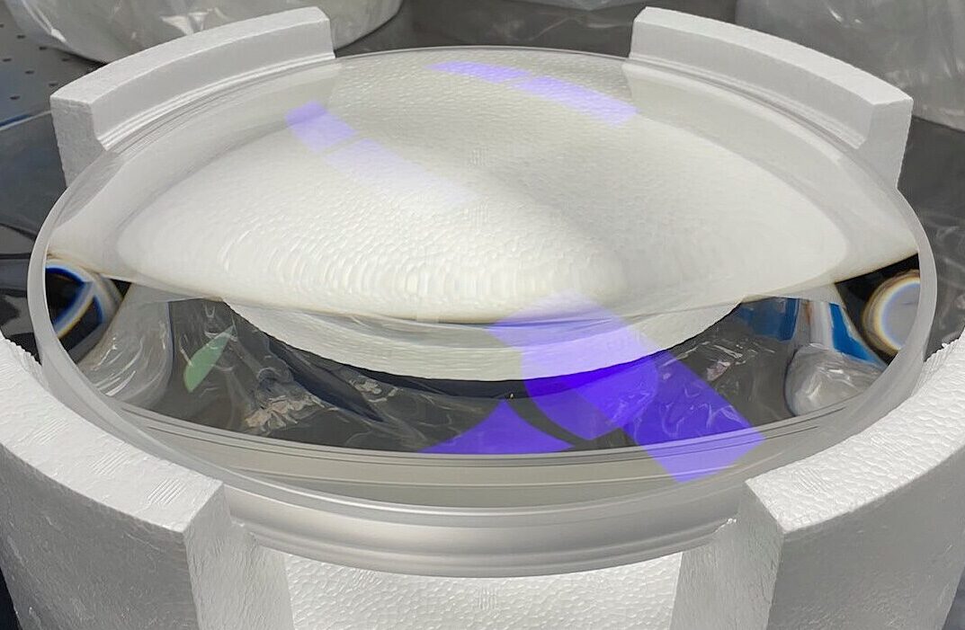 One of seven red camera lenses developed by Nikon planned for assembly on the Giant Magellan Telescope Large Earth Finder instrument at the Harvard Smithsonian Center for Astrophysics.