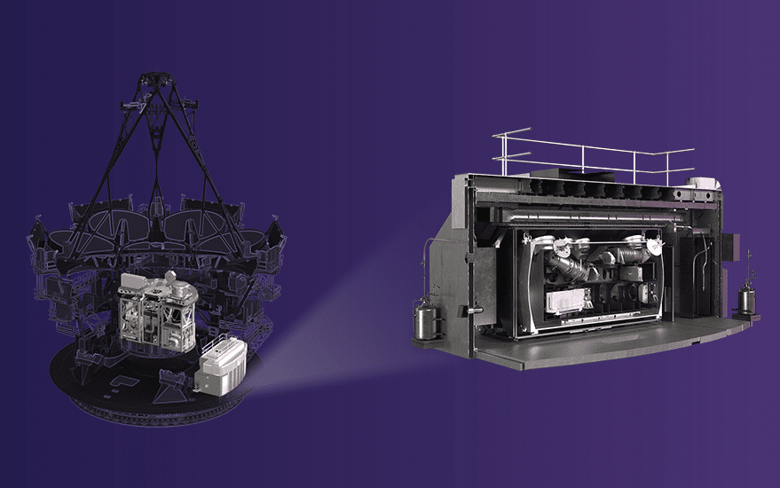 Rendering of Giant Magellan Telescope’s 12-story-tall structure with its suite of instruments highlighted within the Gregorian instrument rotator at the center of the structure (left), and an interior view of the Large Earth Finder instrument (right).