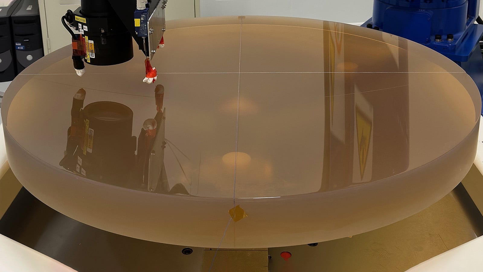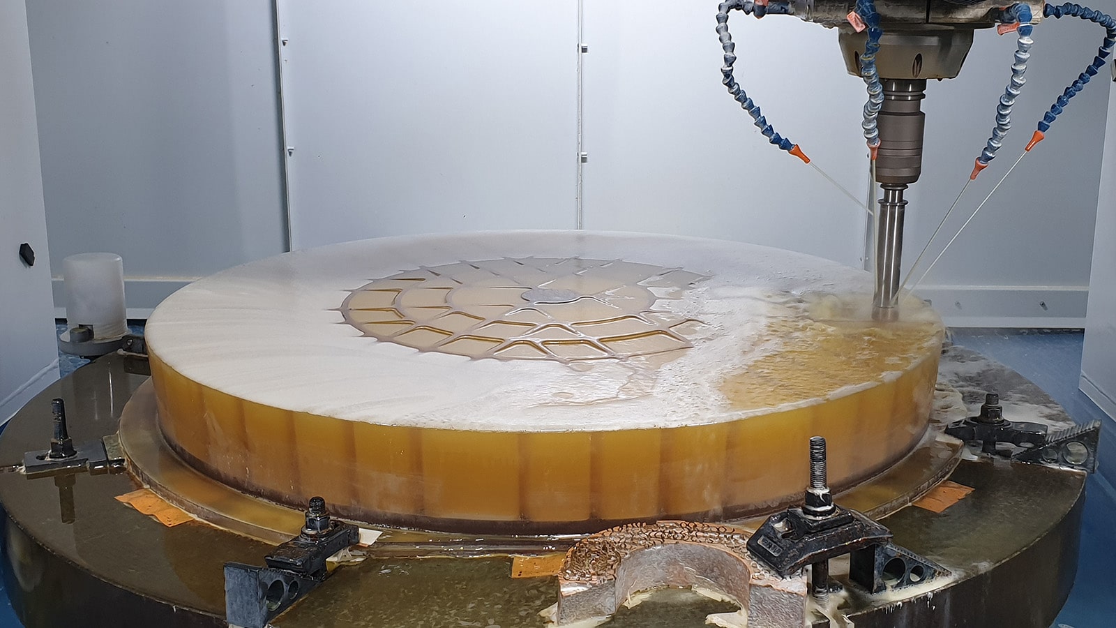 The Giant Magellan Telescope’s first off axis ASM is currently in production with company called AdOptica, a renowned telescope and astronomical instruments design consortium. Following a manufacturing readiness review last year, a subscale Zerodur and full-scale nylon prototype demonstrated the machining process for fabrication. AdOptica’s subcontractor and leader in high performance optomechanical systems, Safran-Reosc, is producing the thin shell face sheet, and the polishing and testing of the concave optical surface is complete. Thinning operations are underway and are approaching the specified 2 mm thickness.