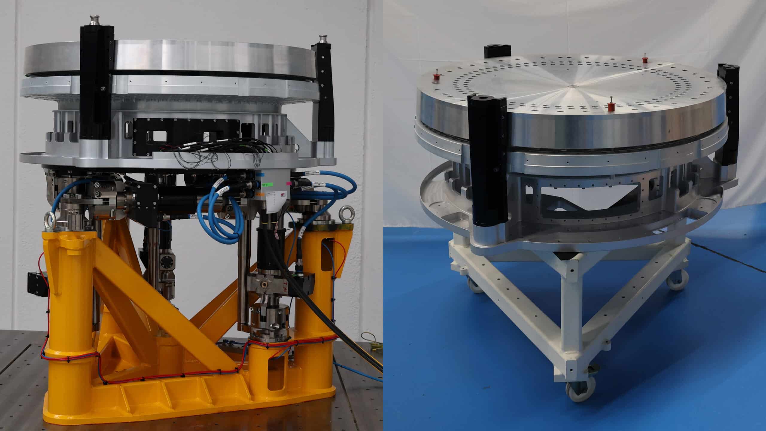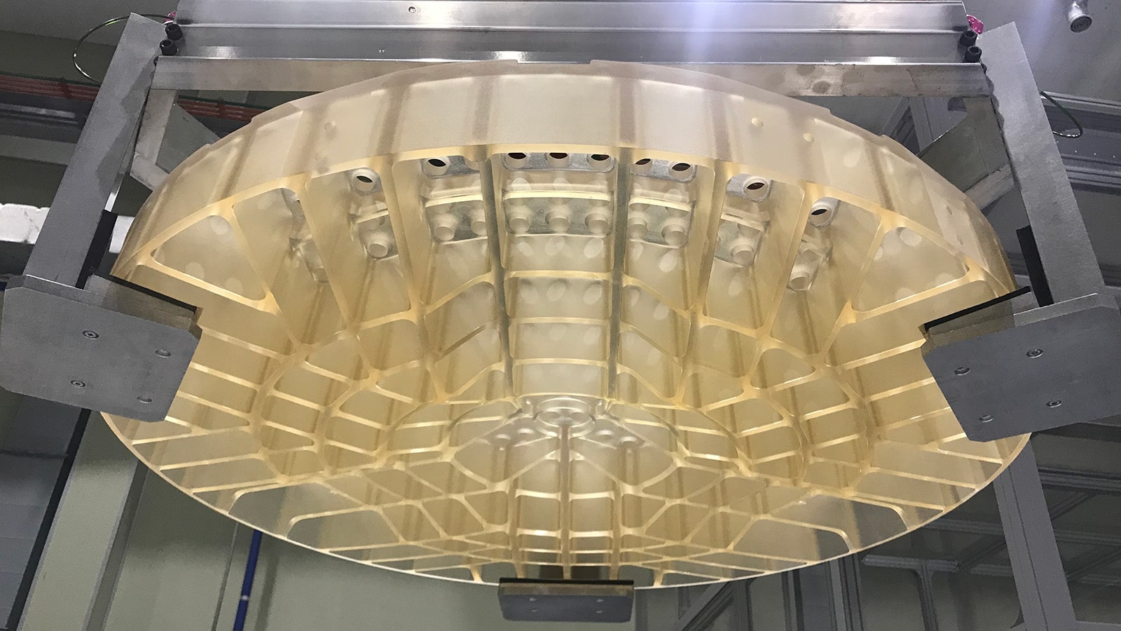 Just as the telescope’s primary mirrors are exceptional (the largest mirrors made anywhere today), the ASMs are also exceptional—made using especially thin glass surfaces. Their reflective surface, known as a “thin shell face sheet,” is extremely flexible because of its 1.05-meter diameter and 2-millimeter thickness, the thickness of a nickel. The thin shell face sheet is made of Zerodur, a structurally stable, glass-ceramic material that is extremely insensitive to thermal changes. The thin shell face sheet will undergo polishing for approximately one year to reach the desired parabolic shape. Magnets are then adhered to the mirror frame, leaving a gap of 150 microns (equivalent to a sheet of paper) between the mirror’s back surface and its frame. Hovering unattached, the thin shell face sheet can deform as directed by the 675 independently controlled voice coil actuators in the frame.