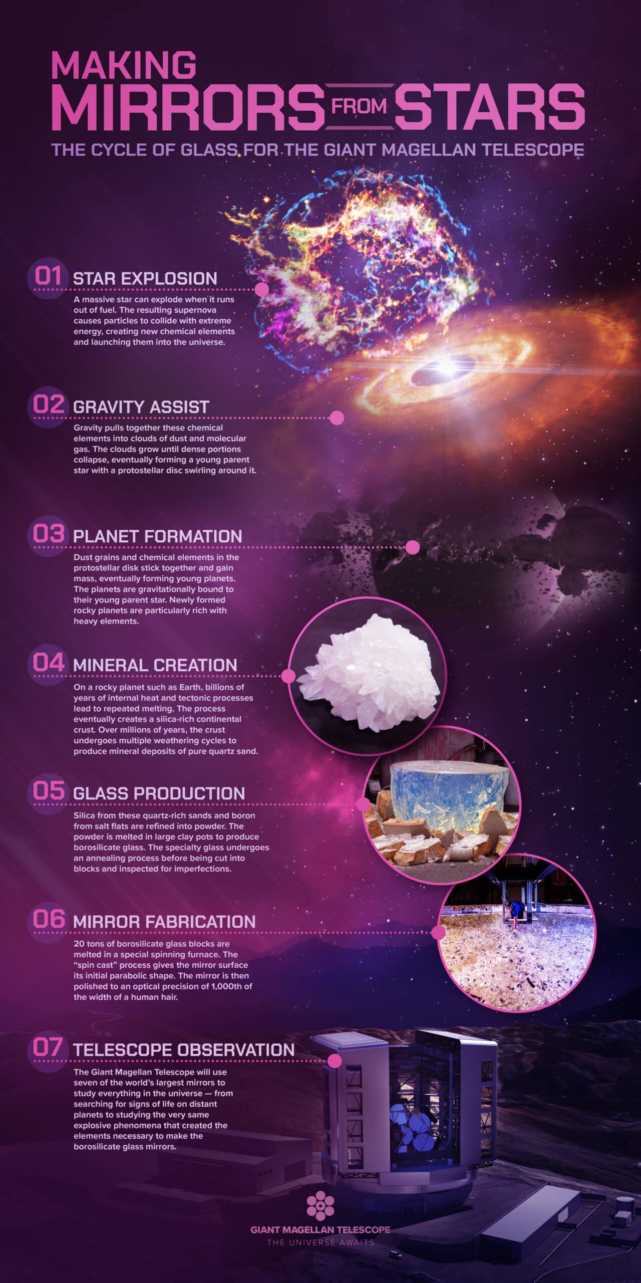 Fast-forward millions of years, the silica-rich continental crust of a rocky planet generates mineral deposits of pure quartz sand. Silica from these quartz-rich sands, and boron from salt flats, are refined into powder that is then melted to produce the borosilicate glass used in the telescope’s giant mirrors.