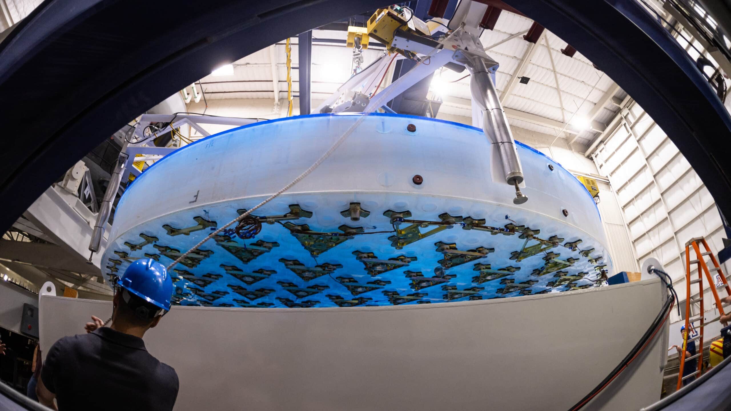 Completed 8.4-meter-diameter primary mirror transport and placement above support system prototype at the University of Arizona’s Richard F. Caris Mirror Lab. Video credit: Damien Jemison, Giant Magellan Telescope – GMTO Corporation.